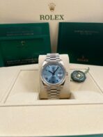 Introducing the Rolex Day-Date 228236 (Year: 2024) – a testament to timeless design and precision. This piece features a blue dial, platinum bracelet, and 40 mm platinum case, making it a statement piece that effortlessly captures attention.