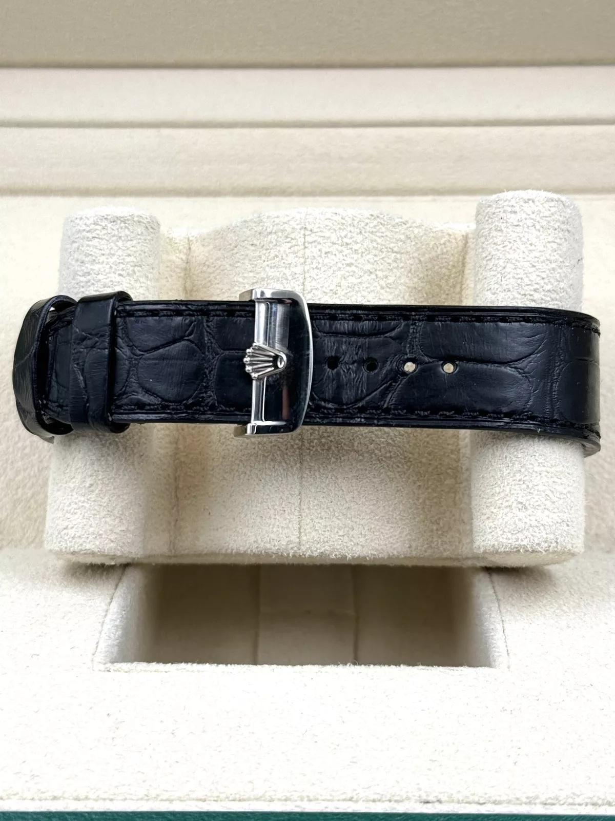 The black dial is minimalist and captivating, featuring applied white gold hour markers and finely crafted dauphine-style hands. A small seconds sub-dial at 6 o’clock adds a touch of vintage charm, while the subtle minute track around the dial’s perimeter enhances legibility. The understated Rolex crown logo at 12 o’clock completes the harmonious design.