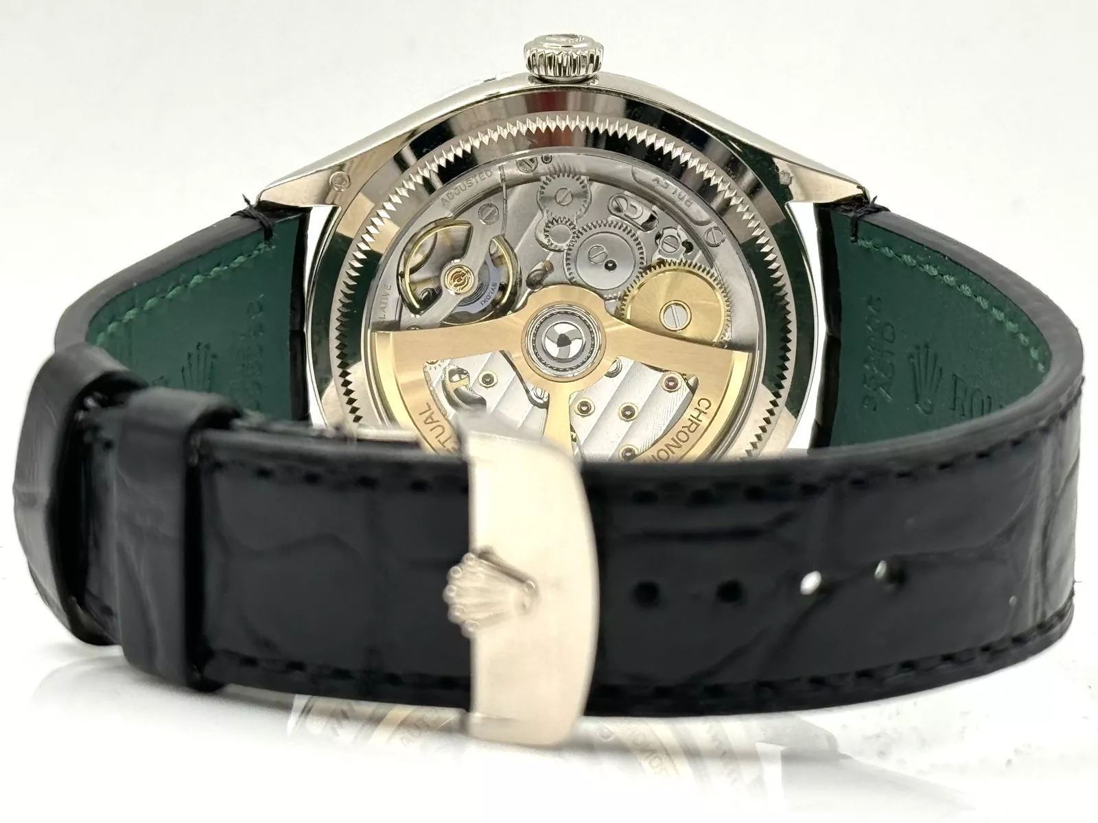 The 39mm case is crafted from 18k white gold, showcasing a polished finish that exudes understated luxury. Its slim profile and domed bezel enhance the watch’s classic proportions, making it a perfect choice for both formal occasions and everyday elegance. A sapphire crystal with anti-reflective coating ensures clarity, while the transparent case back—an uncommon feature in Rolex watches—offers a view of the finely finished movement within.