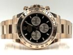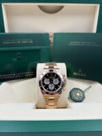 The black dial of the Daytona 126505 provides a striking contrast to the warmth of the Everose gold case, offering a sleek and modern aesthetic. The dial features elegant gold hour markers filled with Chromalight, a luminescent material that ensures excellent visibility in low-light conditions. The signature three sub-dials—a 30-minute counter at 3 o’clock, a 12-hour counter at 9 o’clock, and a small seconds sub-dial at 6 o’clock—are elegantly integrated into the dial’s layout, providing the essential functionality of a high-performance chronograph. The combination of the black dial and Everose gold accents creates a sophisticated and dynamic look, making the Daytona 126505 a true statement piece.