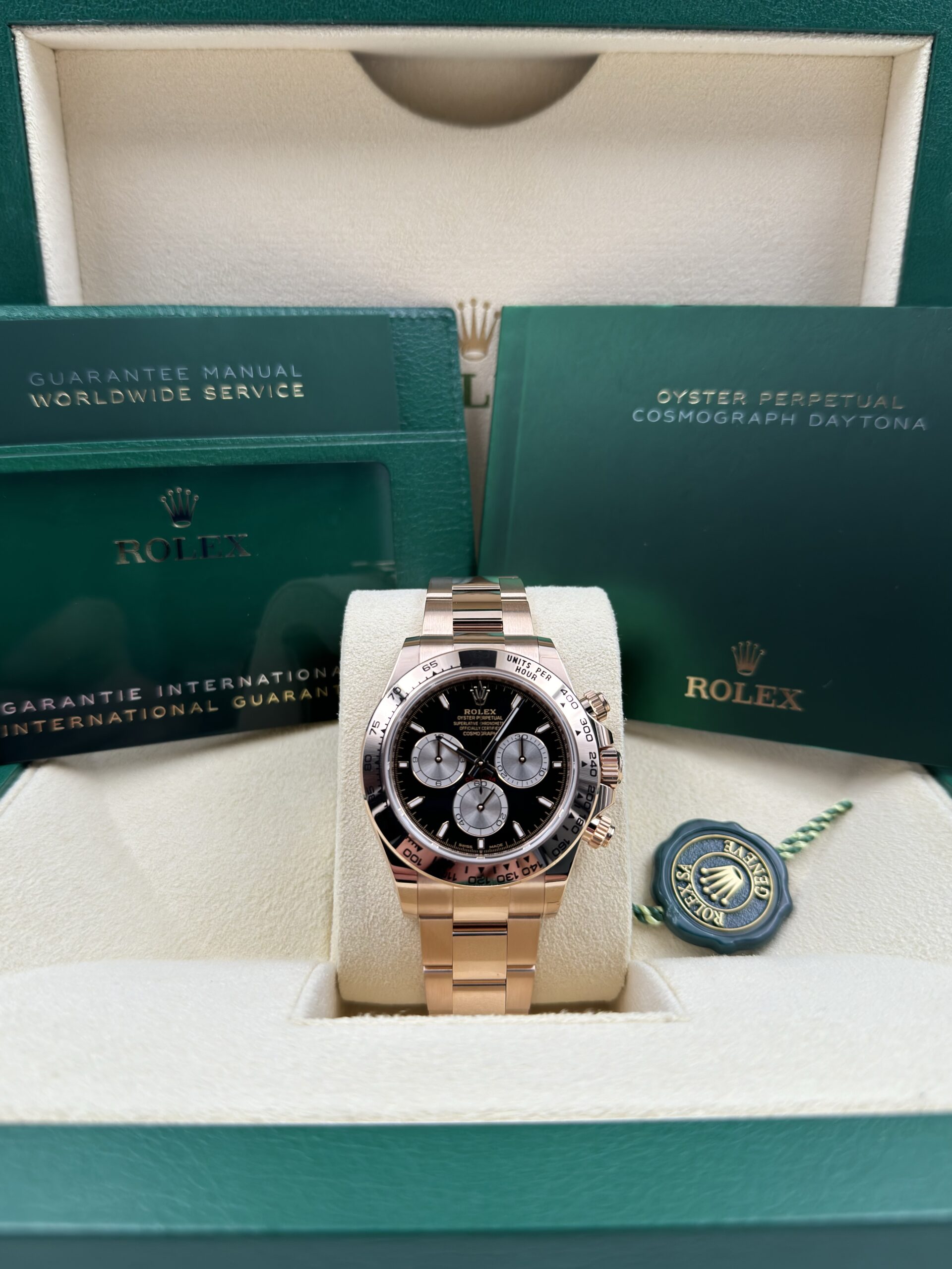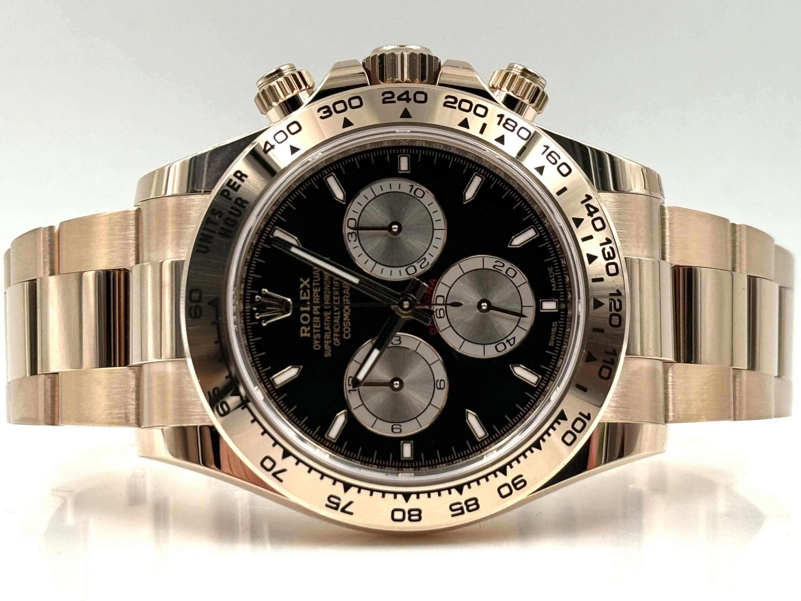 The Daytona 126505 features a 40mm case crafted from 18k Everose gold, Rolex’s exclusive rose gold alloy that ensures lasting beauty and resistance to fading. The polished Everose gold case exudes elegance and luxury, while the sleek design and carefully crafted proportions give the watch a bold yet refined presence on the wrist. The smooth fixed bezel, also in Everose gold, is engraved with a tachymetric scale, allowing wearers to measure average speeds over a given distance—an essential tool for professional drivers and racing fans.