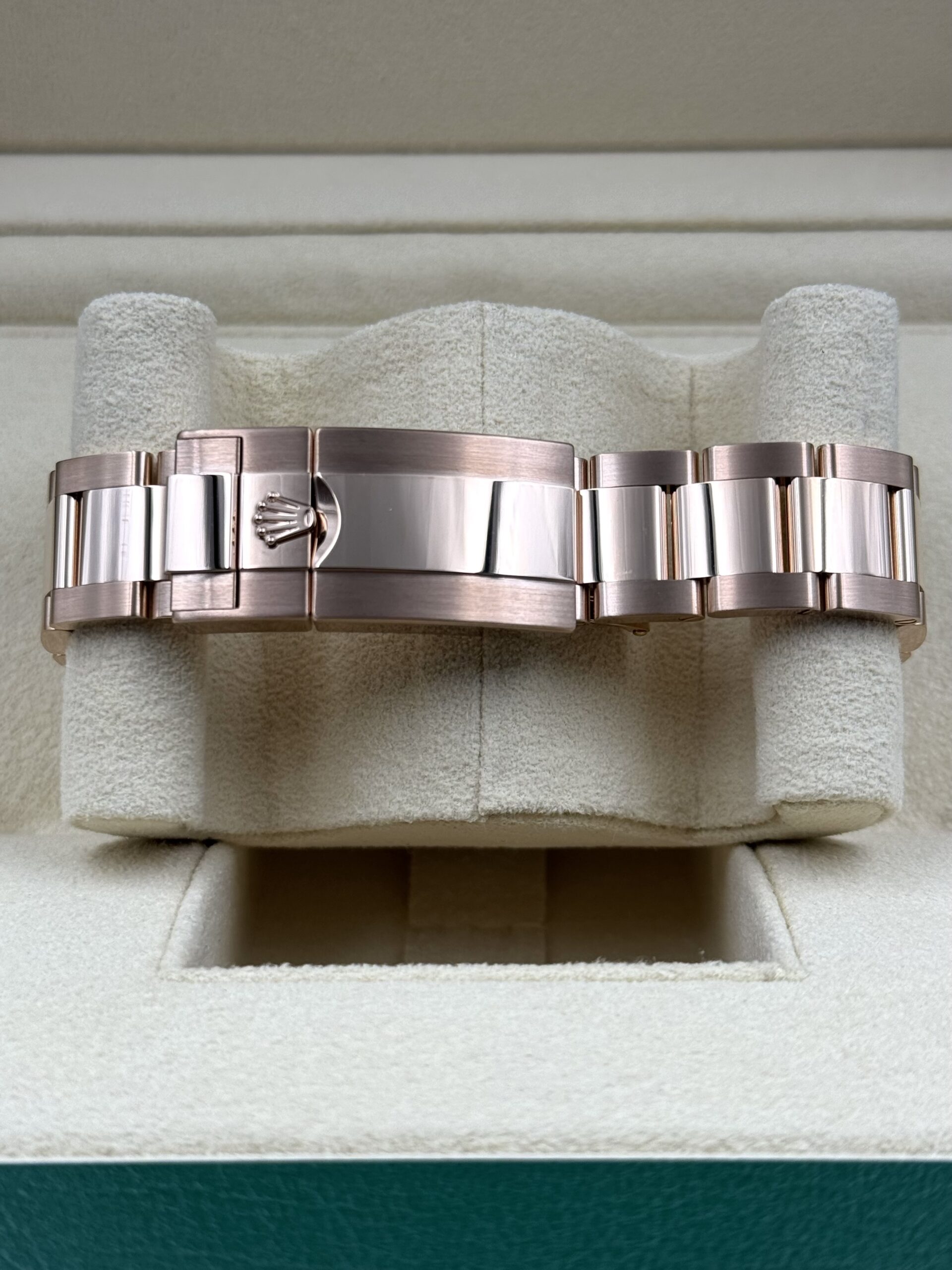 The watch is fitted with the iconic Oyster bracelet, crafted from solid 18k Everose gold. The Oyster bracelet is designed for both comfort and durability, featuring a combination of polished and brushed finishes that enhance the watch’s luxurious appearance. It is equipped with an Oysterlock folding safety clasp and the Easylink 5mm comfort extension link, allowing for quick adjustments to ensure a perfect fit.