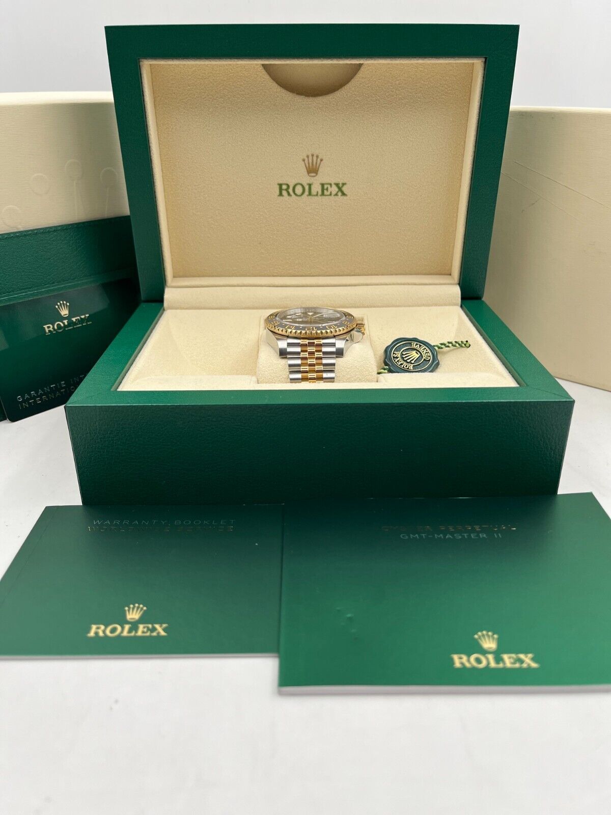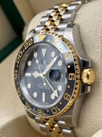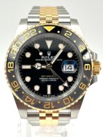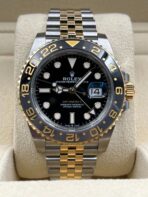 Introducing the Rolex GMT Master II 126713GRNR (Year: 2024) – a testament to timeless design and precision. This piece features a black dial, two tone yellow gold/stainless steel bracelet, and 40 mm steel case, making it a statement piece that effortlessly captures attention.