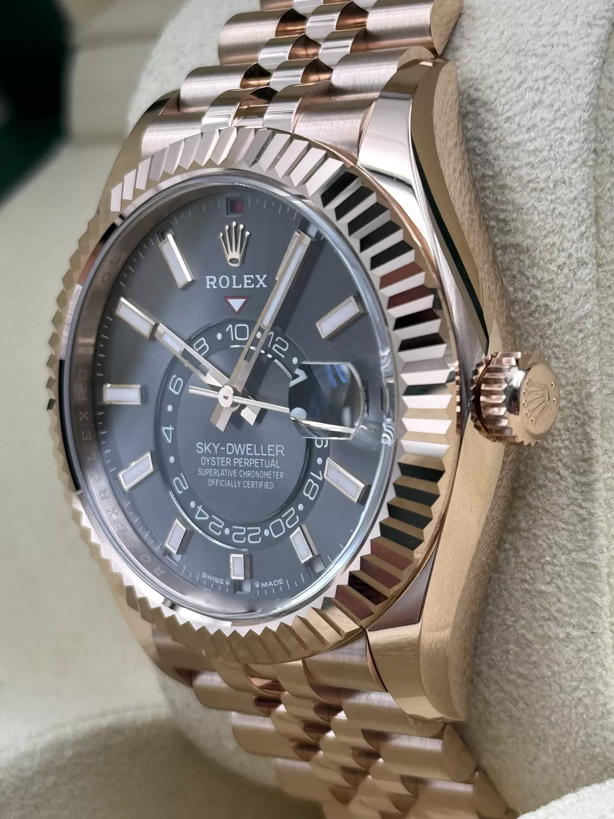 The 42mm Oyster case, crafted from Rolex’s proprietary Everose gold, exudes refinement and durability. The signature fluted bezel not only enhances the watch’s aesthetic appeal but also serves as a key functional element, enabling seamless adjustments to the dual-time display and Saros annual calendar via Rolex’s patented Ring Command system. With water resistance up to 100 meters, the Sky-Dweller is as robust as it is elegant.