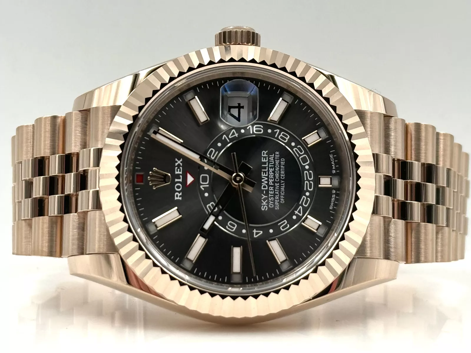 The Rolex Sky-Dweller 336935 with a rhodium dial and Jubilee bracelet is a sophisticated masterpiece, combining innovative functionality with a modern, elegant design. Crafted from 18k Everose gold, this luxurious timepiece is designed for discerning travelers and collectors who value both advanced watchmaking and timeless style.